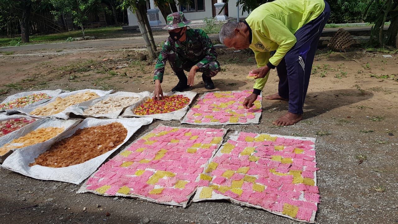 Namun kali ini Sucipto mendapat bala bantuan dari anggota Satgas TMMD, yakni Serda Sukarji. Selagi hari ini cuacanya cukup panas, maka kerupuk mentah yang masih basah semuanya di jemur di pelataran rumahnya.