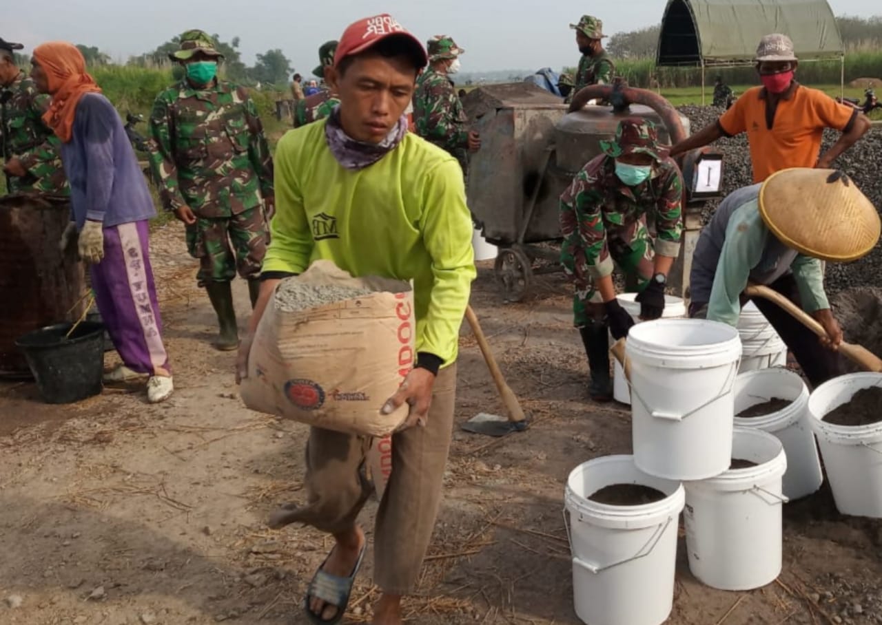 Pati – Darminto (30) warga RT.02/03, Desa Tamansari, Kecamatan Jaken selalu tampil semua disetor pelaksanaan kegiatan pengecoran jalan sasaran fisik TMMD Reguler ke-111 Kodim Pati. Terlihat hari ini ia sedang membawa setengah semen menuju ke mesin molen. Pria yang selalu mengenakan kaos hijau itu tidak pernah absen setiap harinya, Rabu (23/6/2021).
