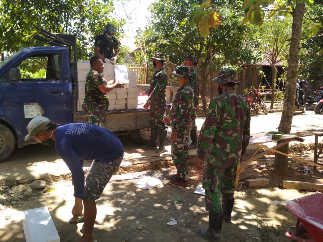 Pati – Percepatan pembangunan sasaran fisik TMMD bedah Rumah Tidak Layak Huni (RTLH) program Tentara Manunggal Membangun Desa (TMMD) Reguler ke-111 Kodim Pati, Pelda Sukarbin bersama anggota Satgas TMMD lainnya dengan semangat bergotong royong langsir bahan material berupa habel, untuk keperluan bedah rumah milik Supawi (56) warga Dukuh Kemiri RT.04/01, Desa Tamansari, Kecamatan Jaken, Kabupaten Pati, Jawa tengah, Minggu (13/6/2021).
