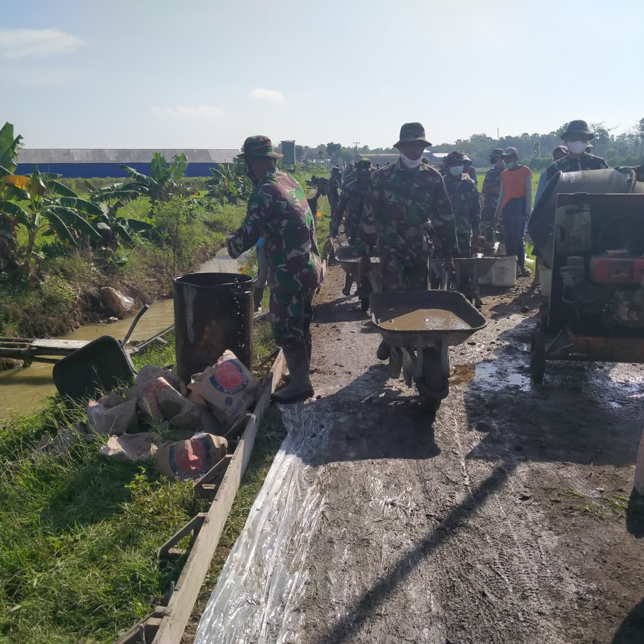 Terlihat dilokasi jalan desa yang menjadi sasaran utama pembangunan dalam program TMMD Kodim 0718/Pati ini dipenuhi oleh anggota TNI dan warga yang sedang berkolaborasi pada pembangunan jalan perkerasan dengan cor beton.