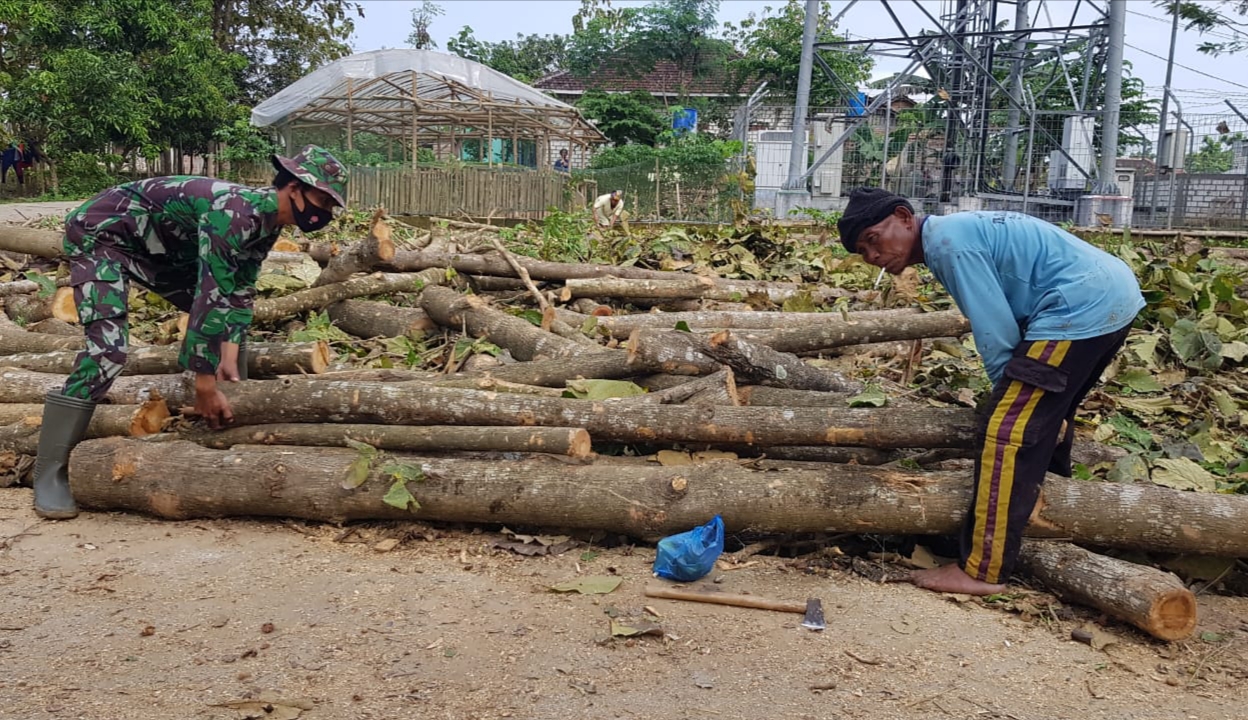 Terlihat hari ini Bapak Karnawi sedang memanen tanaman jatinya untuk dijual ke pengusaha mebel. Dengan dibantu Serda Sukarji anggota Satgas TMMD Reguler ke-111 Kodim Pati mengangkat batang kayu jati yang selesai ditebang menggunakan mesin senso, Sabtu (03/07/2021).