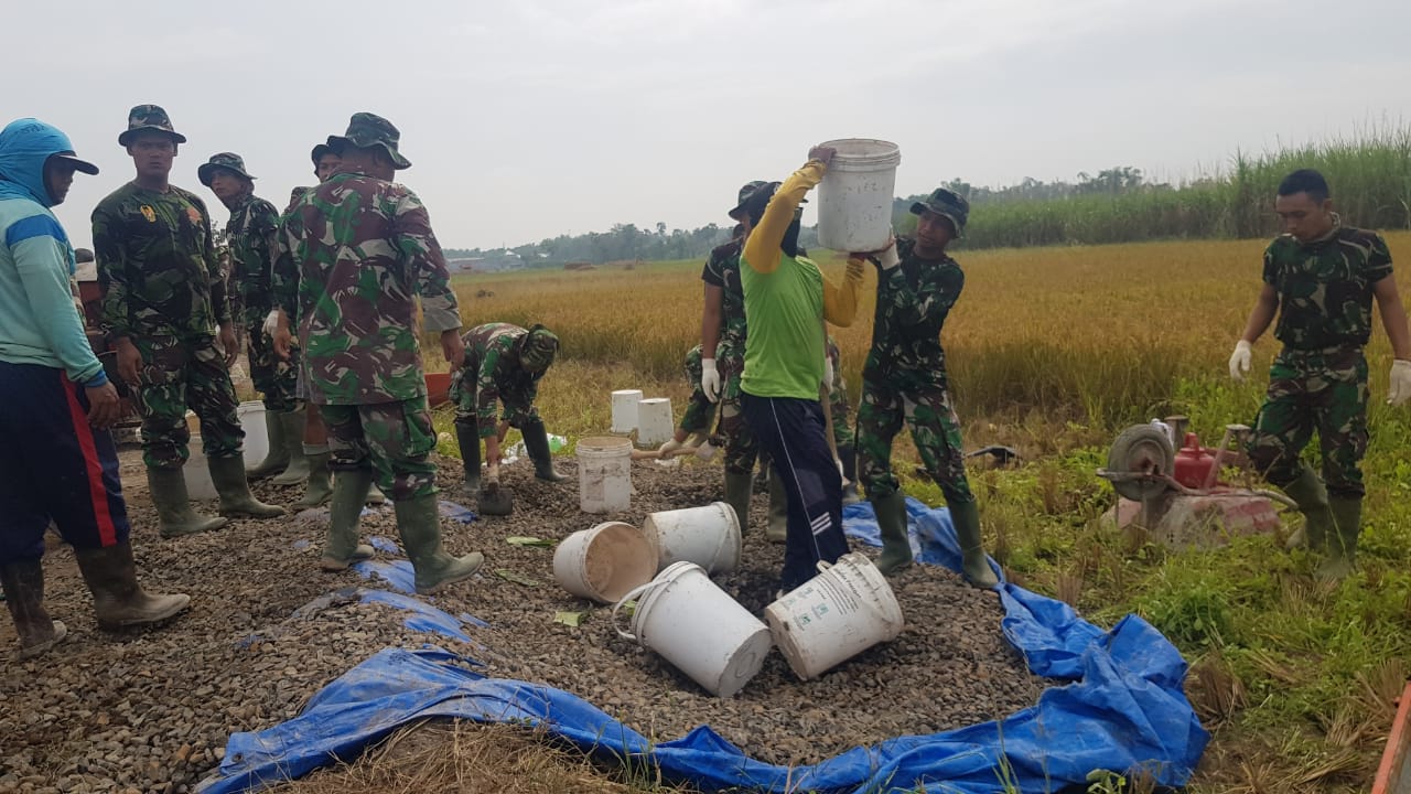 Sementara itu Serda Surahman saat melangsir batu split menggunakan ember mengatakan, fokus pembuatan adonan cor beton untuk segera digelar agar mencapai hasil yang maksimal, “saya hari ini melangsir matrial untuk digunakan sebagai adukan dimesin molen, karena cuaca mendung kita maksimalkan pekerjaan dari pagi sampai siang,” katanya disela mengangkat ember yang diisi batu split.