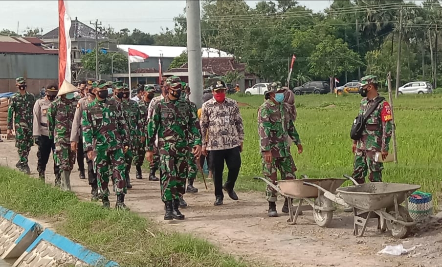 Pati – Memasuki paruh waktu pelaksanaan TNI Manunggal Membangun Desa (TMMD) Reguler ke-111 tahun 2021 Kodim 0718/Pati di Desa Tamansari, Kecamatan Jaken, Kabupaten Pati, Komandan Korem 073/ Mkt, Kolonel Arm Putranto Gatot Sri Handoyo, S.Sos., M.M., meninjau lokasi TMMD, kemarin. Kamis (01/7/2021)