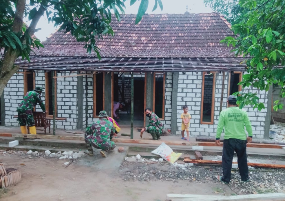 Salah satu dari 16 unit penerima RLTH, Sukur (61), RT 03 RW 02, warga Dusun Pandaan Desa Tamansari yang rumahnya direhab. Terlihat tukang yang sedang mempersiapkan pembuatan teras rumah Mbah Sukur bersama warga lain dan anggota Satgas, pada hari Sabtu (19/06/2021) pagi.