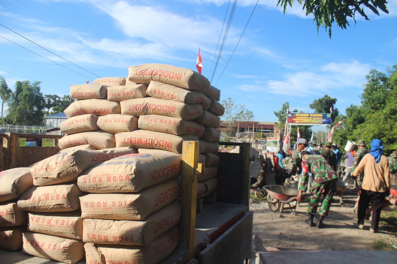Sejumlah material pendukung bahan beton cair sudah dirapatkan ke lokasi untuk segera menyelesaikan program betonisasi sebagai sasaran pokok TMMD Kodim Pati tersebut.