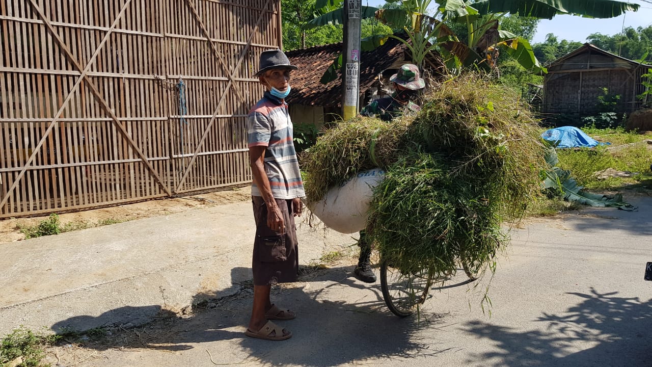 Seperti yang dilakukan Serda Fajarianto yang membantu Tarno (70) warga Dukuh Pandahan, Desa Tamansari membawa rumput untuk pakan ternaknya yang baru diambil dari sawah. Setiap sore hari warga desa Tamansari rutinitas mereka mencari rumput untuk pakan ternak, yang diambilnya baik dari sawah atau kebun, Kamis (08/7/2021).