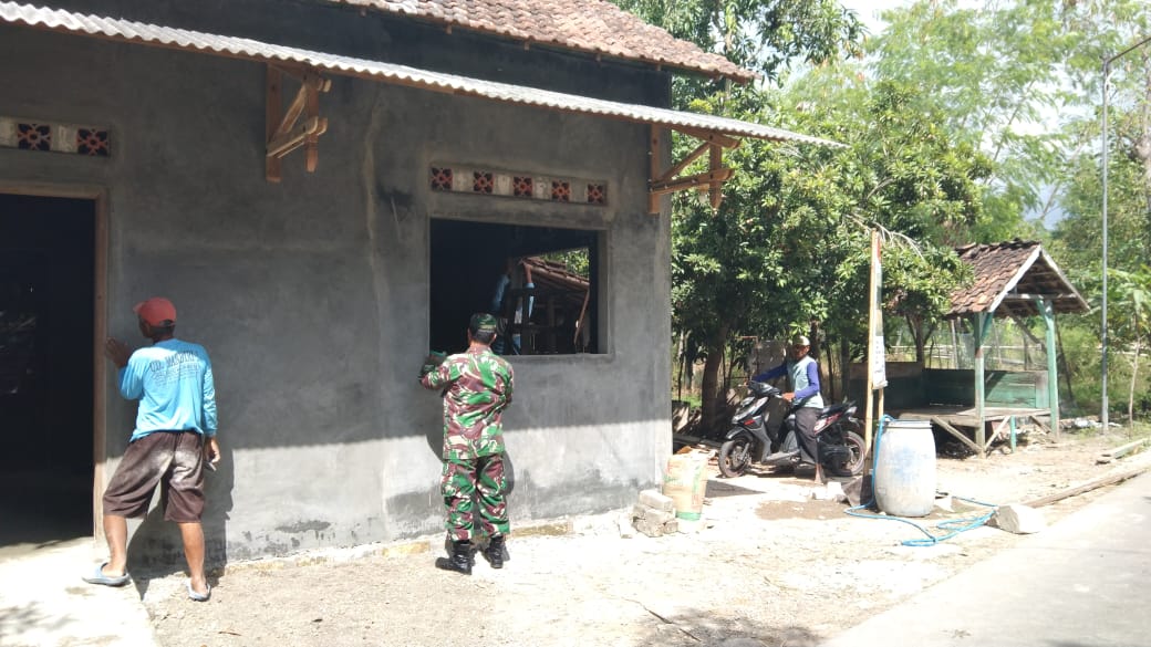 Terlihat pada rumah Mudadi yang terletak di Desa Tamansari, Kecamatan Jaken ini plesteran tembok sudah di aci dengan semen sehingga tampak halus, Sertu Joni Iskandar yang turut pekerjaan tersebut mengatakan rencananya nanti siang akan memasang daun pintu dan jendela, kini ia akan memasang plesteran pada lantai.