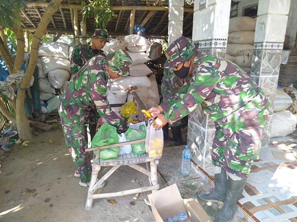 Anggota satgas TNI Manunggal Membangun Desa (TMMD) Reguler ke-111 Kodim 0718/Pati, di Desa Tamansari Kecamatan Jaken kabupaten Pati, yang sedang melaksanakan istirahat sejenak melepas lelah, sambil menikmati hidangan yang ada.