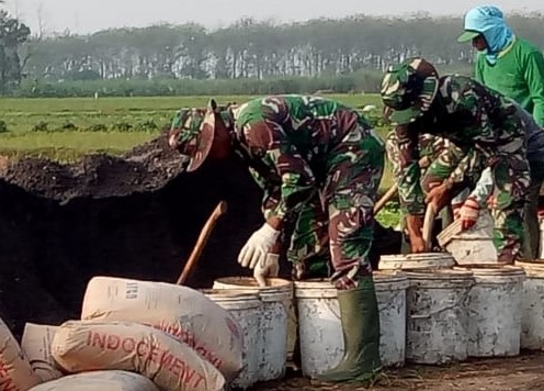 Pati – Satgas TNI Manunggal Membangun Desa (TMMD) Reguler ke-111 Kodim 0718/Pati di Desa Tamansari, Kecamatan Jaken, Kabupaten Pati, dalam melaksanakan kegiatan pembangunan fisik selalu kompak bahu membahu melangsir material pasir bersama warga dengan menggunakan ember sebagai alatnya, Kamis (01/7/2021).