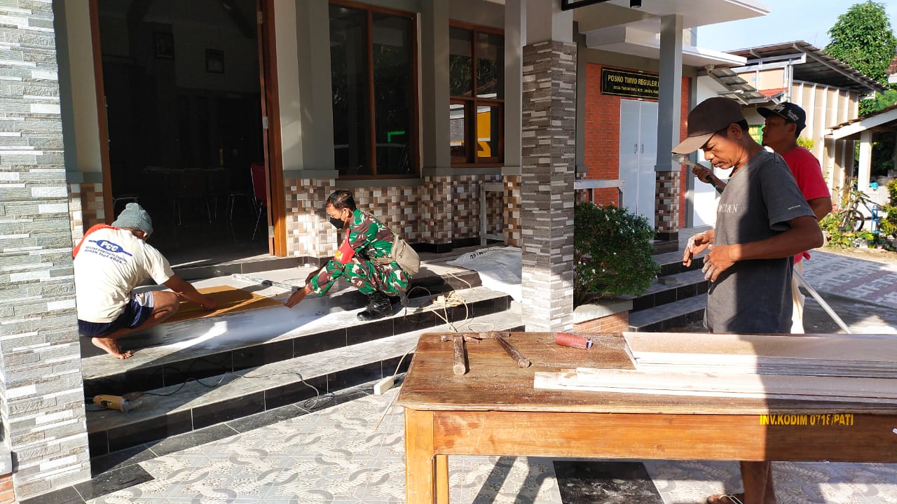 Panitia TMMD bersama anggota satgas TMMD sibuk memperbaiki dan mempercantik balai desa Tamansari sebagai tempat utama pembukaan TMMD.