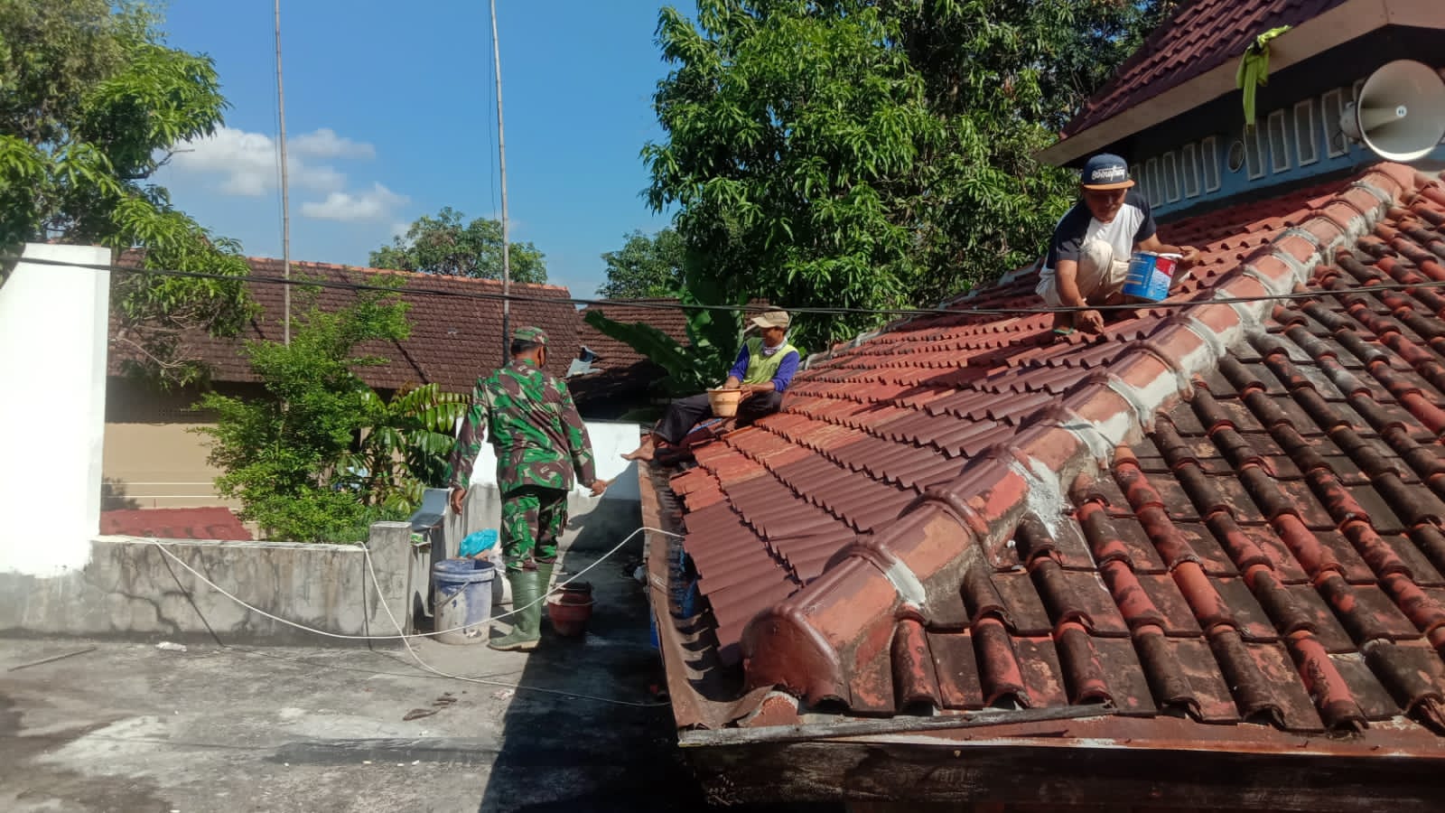 Kondisi cuaca pun bersahabat menunjang warga dan anggota Satgas untuk mengerjakan perbaikan khususnya pengecatan genteng atap masjid.