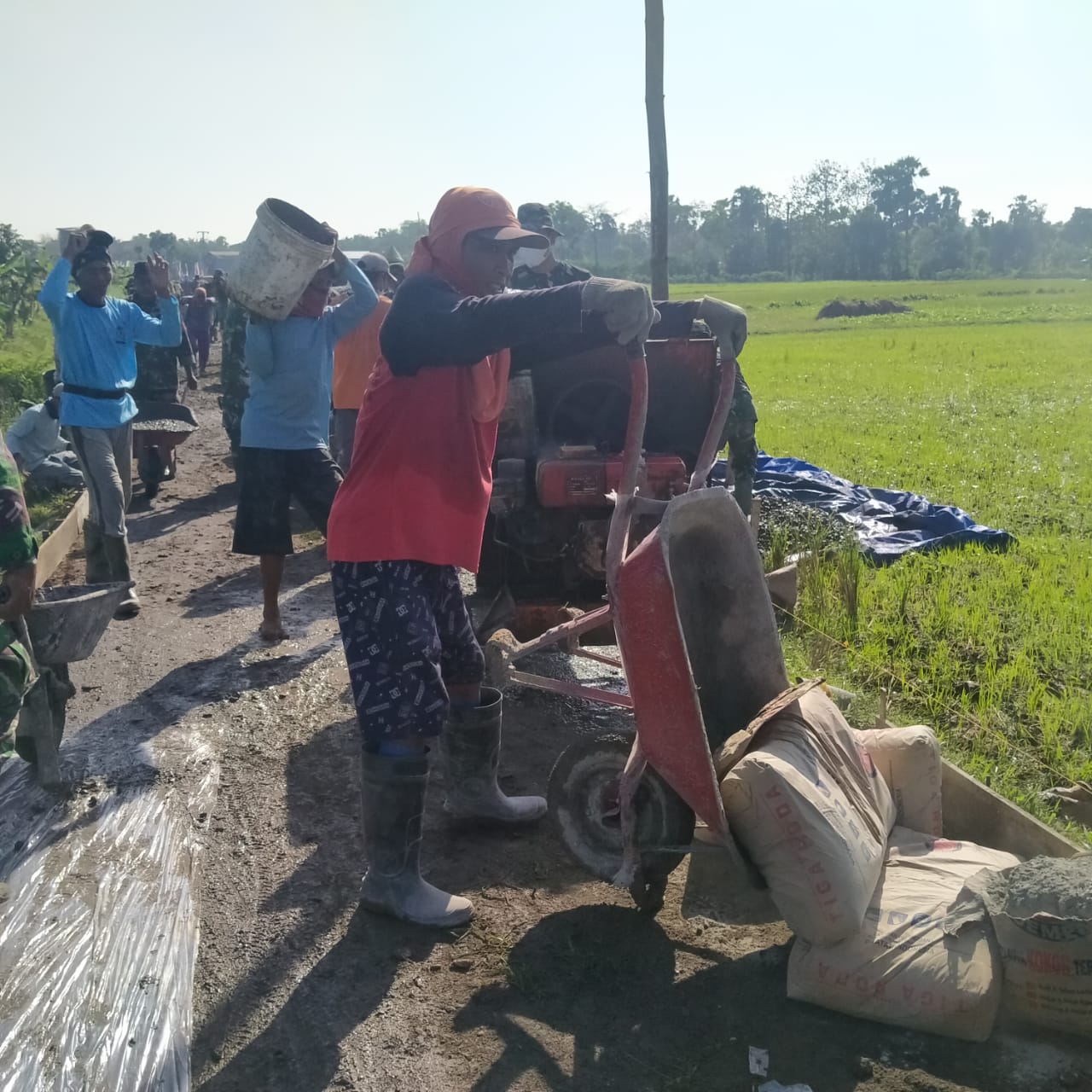 Pati- Suyono (43) Warga Desa Tamansari, Kecamatan Jaken Kabupaten Pati, sangat semangat dan antusias ikut membantu melangsir semen menggunakan artco yang akan dilgunakan untuk pengecoran jalan rabat beton desa,