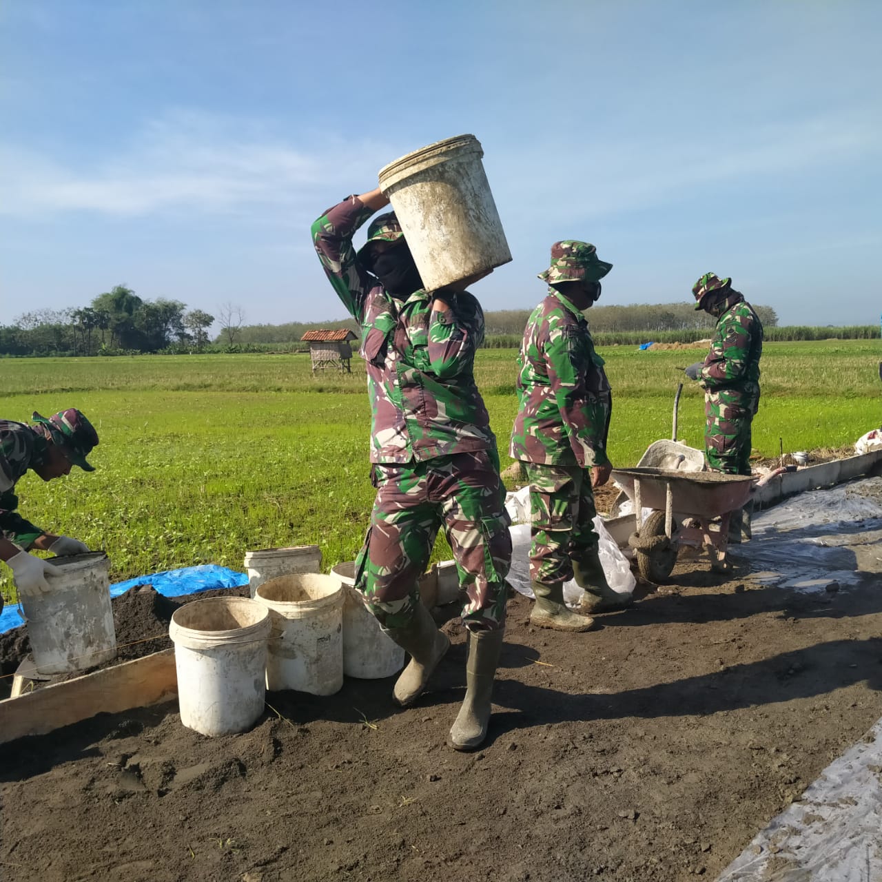Terlihat anggota TNI satuan tugas TMMD dan warga sudah melakukan aktivitasnya. Dalam pantuan dengan semangat Serda Pujiwantoro mengangkat ember yang telah terisi pasir, yang selanjutnya akan dituangkan ke mesin molen yang sudah berputar.