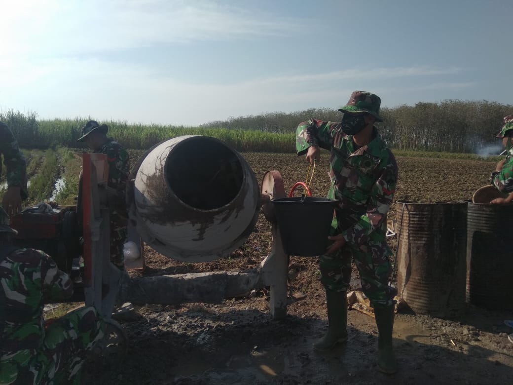 Pengecoran jalan terus dikebut. Meskipun lokasinya terletak di antara areal persawahan dan panas terik matahari terasa membakar kulit, namun hal itu tidak menyurutkan niat anggota TNI dan masyarakat untuk terus bekerja.