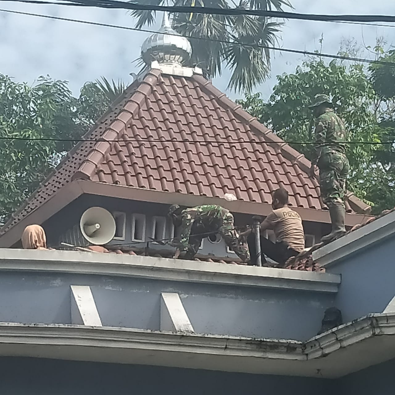 Untuk kelancaran pembangunan rehab masjid, bagaimana pun keadaan cuaca tidak menjadikan suatu halangan bagi prajurit yang ada disana. Ini terlihat beberapa prajurit TNI masih asik bekerja dalam pembenahan atap meski cuaca panas.
