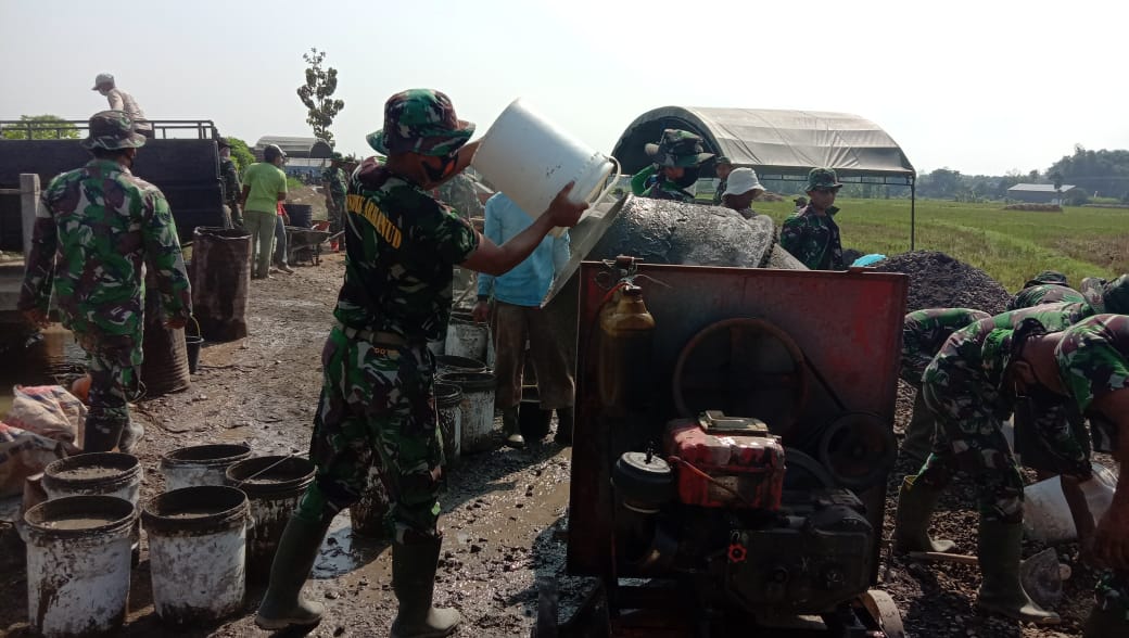 Pati – TNI Manunggal Membangun Desa (TMMD) Reguler ke-111 Kodim 0718/Pati di Desa Tamansari, Kecamatan Jaken, Kabupaten Pati pengerjaan pembangunan fisik berupa pengecoran jalan sepanjang 1.450 Meter memasuki Minggu ke dua.
