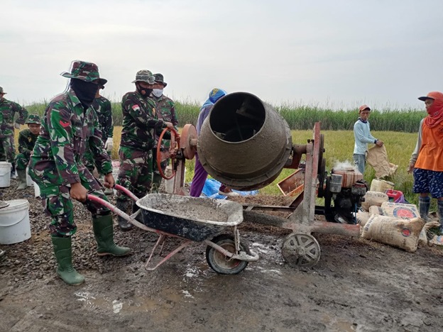 Dari pantauan, tampak sejumlah TNI anggota Satgas TMMD dengan dibantu warga melangsir adukan cor dengan angkong dan ember. Dengan alat yang seadanya anggota Satgas TMMD bersama masyarakat melaksanakan pengecoran jalan sepanjang 1,45 Km, meskipun begitu hasil yang dicapai sangat bagus.
