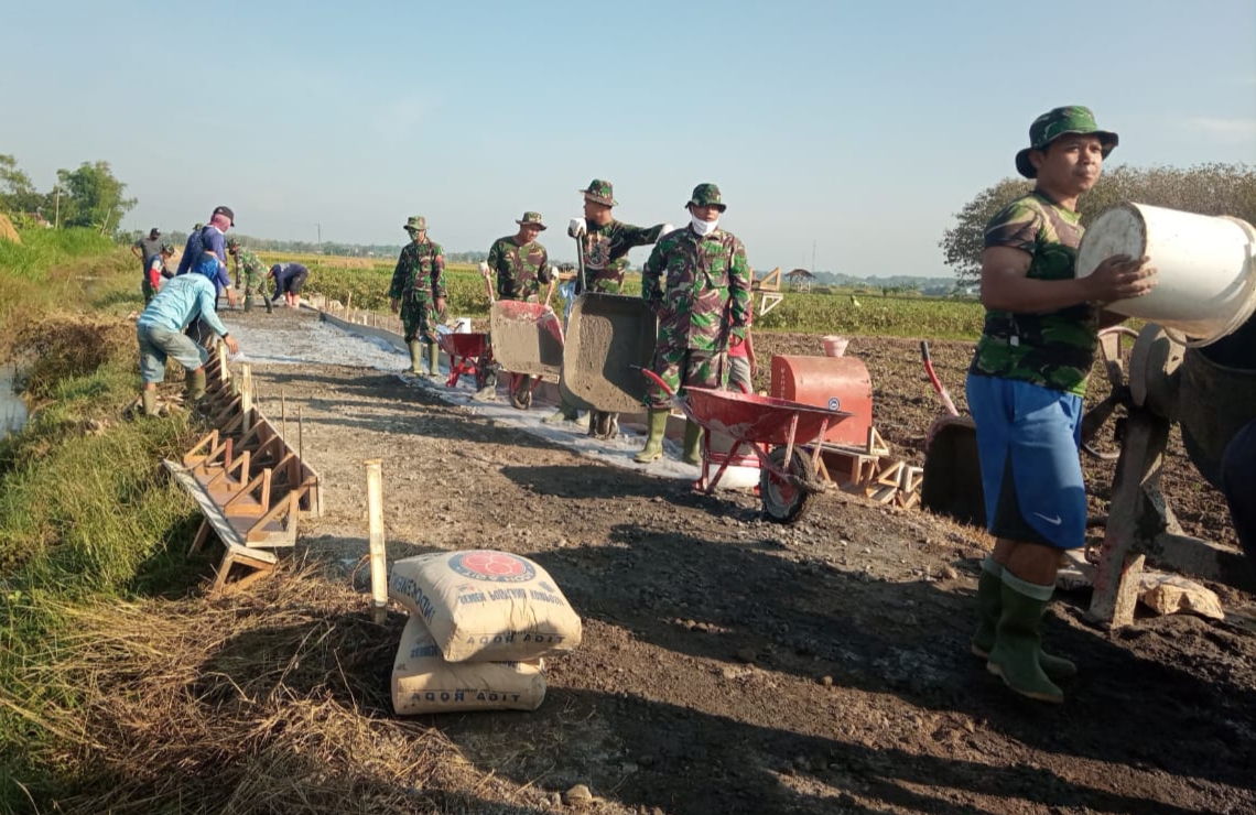 Pati – Teriknya matahari tidak mengurangi semangat Satgas TMMD Reguler ke-111 Kodim Pati dilokasi pengecoran jalan di Desa Tamansari, Kecamatan Jaken, Kabupaten Pati, Jawa tengah. Mereka terlihat serius meratakan adukan cor yang dilangsir dari mesin molen.