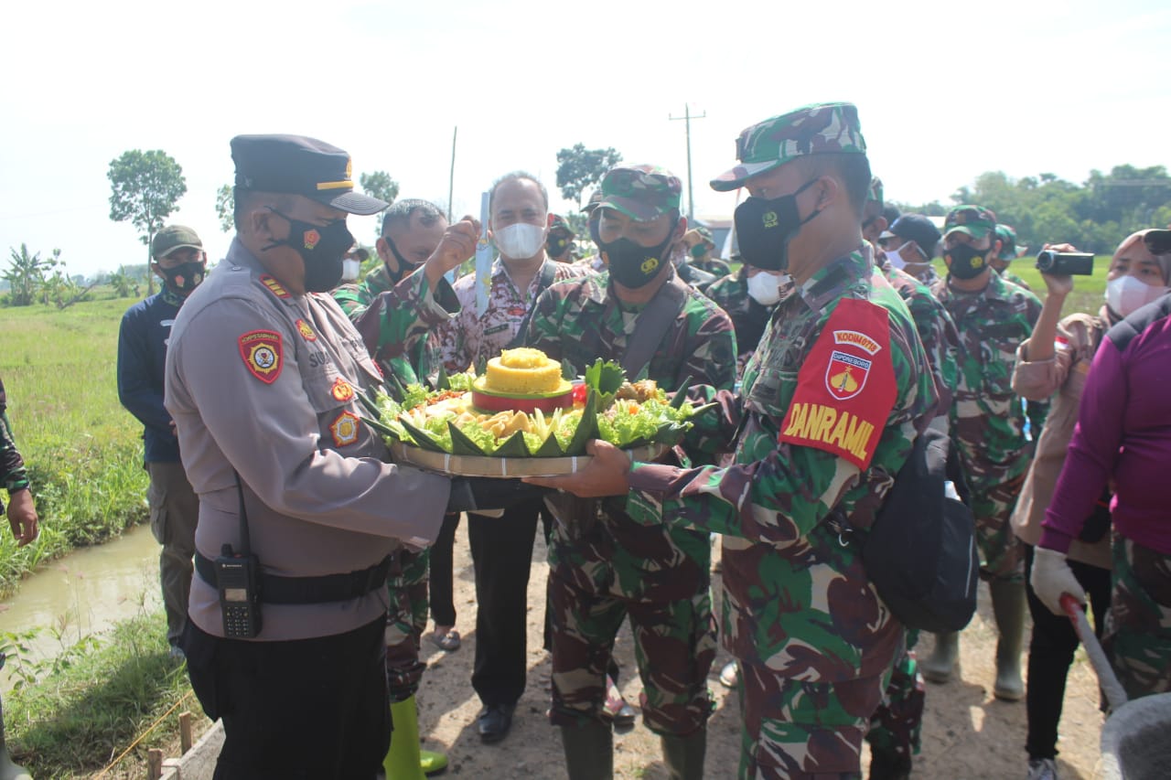 Dan SSK TMMD Kapten Kav Budi Karyadi, SE langsung menyerahkan nasi tumpeng kepada Kapolsek Jaken AKP Subadi,SH.