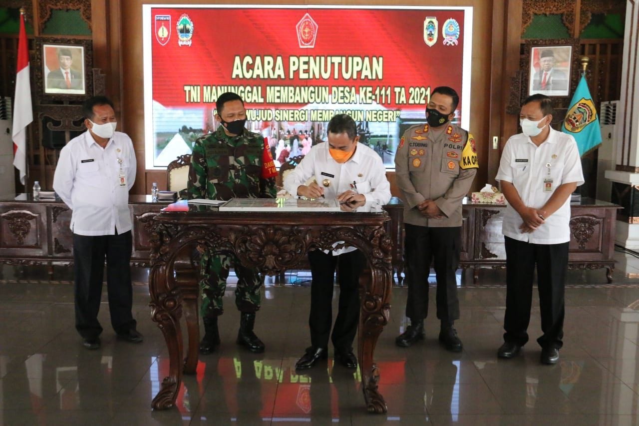Pati – Komandan Kodim 0718/Pati, Letkol Czi. Adi Ilham Zamani S.E, M.I.Pol, menyerahkan Naskah TMMD Reg 1111 kepada Bupati Pati H. Hartyanto berlangsung di Pendopo kabupaten Pati, untuk ditanda tangani, Hal ini berkaitan dengan suasana virus Covid-19 sehingga upacara penutupan dilapangan di tiadakan. Kamis (15/07/2021).