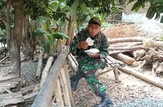 Disisi lain tampak anggota Satgas TMMD yang makan sendirian dibawah pohon jambu milik warga. Dialah Sertu Marmo salah satu TNI personil Satgas yang sedang menikmati menu makanan siang hari ini dengan lahapnya. Walaupun menu yang sangat sederhana, namun dirinya tidak peduli dengan orang sekitarnya, fokus menyantap nasi dan lauk yang ada di piringnya, Jum’at (09/7/2021).