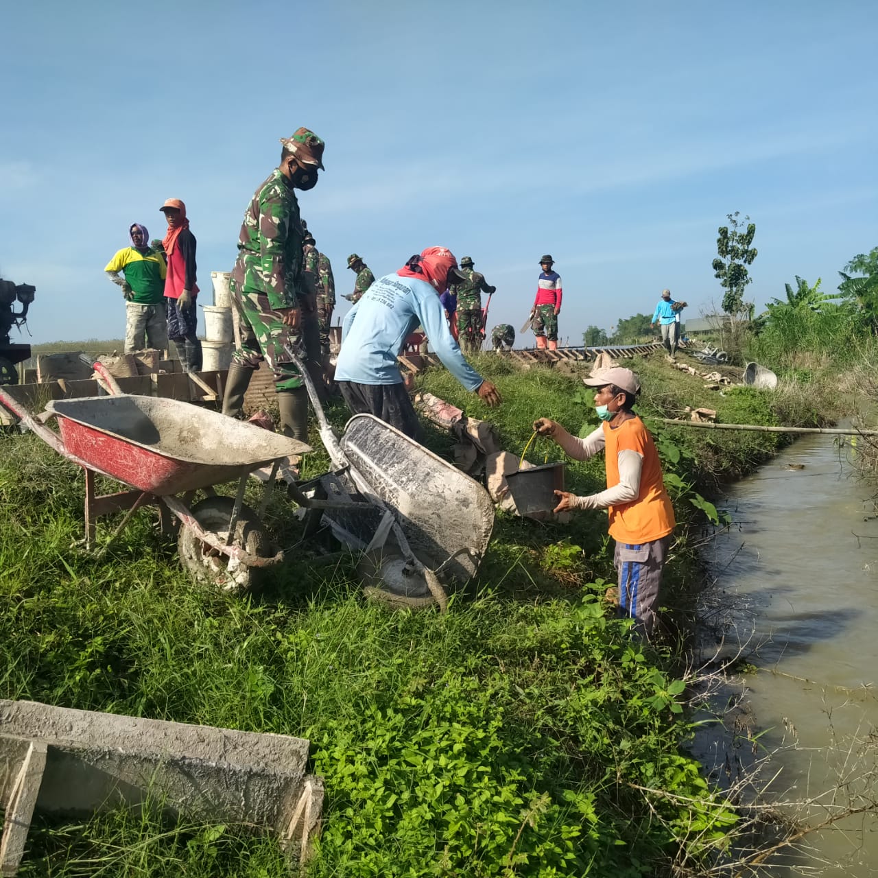 “Serius tapi santai, meski cuaca panas tetep gas terus lah ya, biar cepat rampung terus ngopi kita, hahaha,”Seloroh Sertu Sutriman(38), sedikit iseng bercanda diantara rekan kerja.