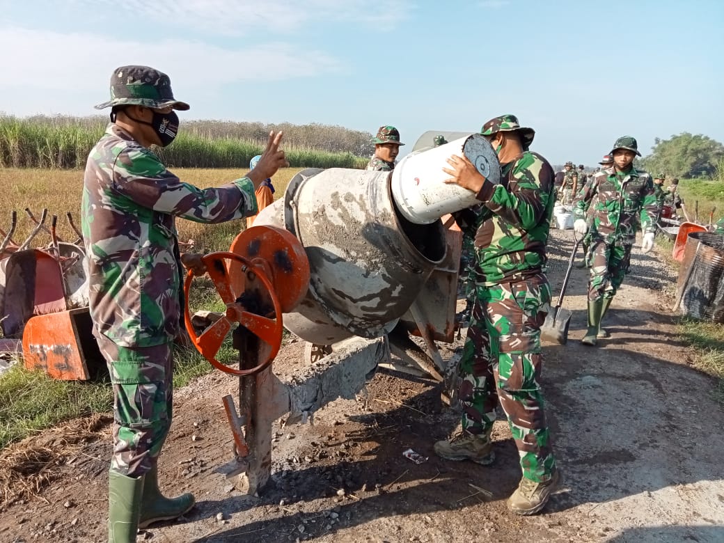 PATI – Pengerjaan pengecoran jalan di Desa Tamansari, Kecamatan Jaken, Kabupaten Pati, Jawa Tengah, terus dikebut anggota Satgas TMMD Reguler 111 Kodim 0718/Pati dan warga setempat, agar sesuai target sebelum program TMMD tersebut ditutup 14 Juli 2021 mendatang.