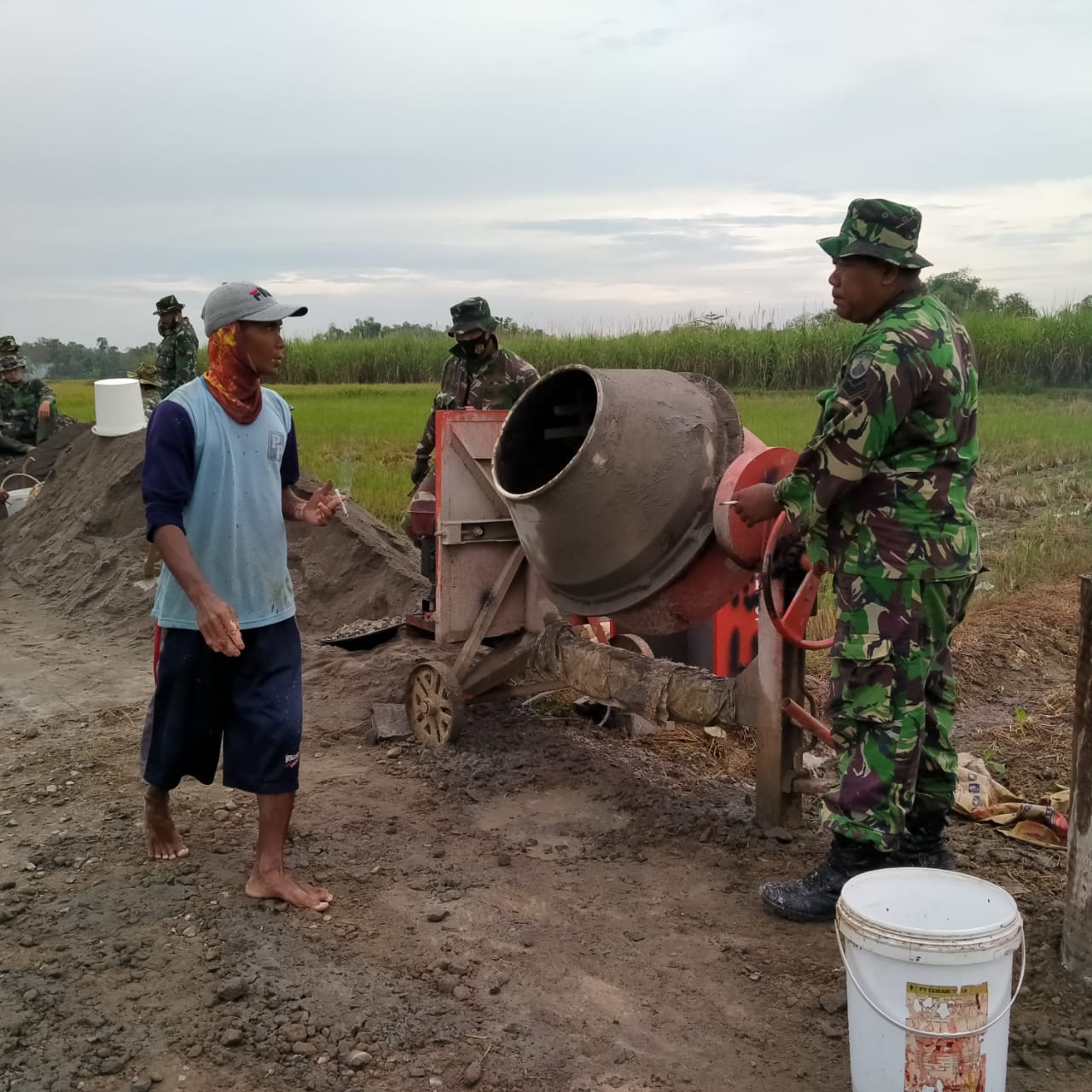 Pati- Langit masih terlihat menampakkan keteduhannya, suasana masih terasa sejuk ketika anggota satuan tugas TNI Manunggal Membangun Desa (TMMD) Ke 111 Kodim 0718/Pati yang berada di lokasi pembangunan betonisasi jalan di Desa Tamansari Kecamatan Jaken Kabupaten Pati pagi ini. Senin,(21/06/2021).