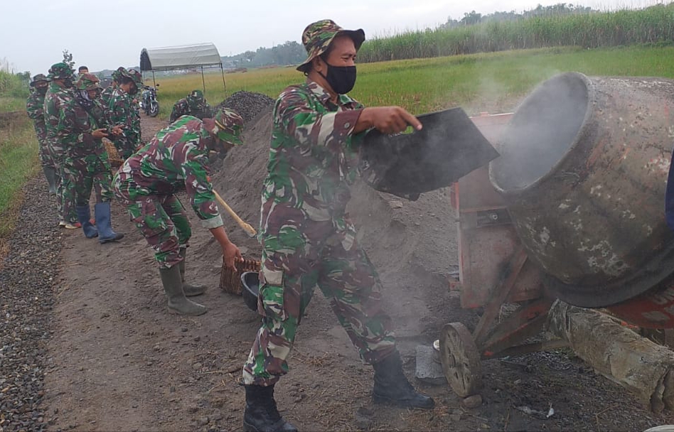 Suasana seperti ini dimanfaatkan anggota Satgas TMMD Reguler ke-111 Kodim Pati untuk start lebih awal dalam pengerjaan pengecoran jalan. Seperi terlihat Serda Sutrisno anggota Koramil Tambakromo yang tergabung dalam Satgas TMMD dengan penuh semangat memasukkan batu koral kedalam mesin molen, Kamis (17/6/2021).
