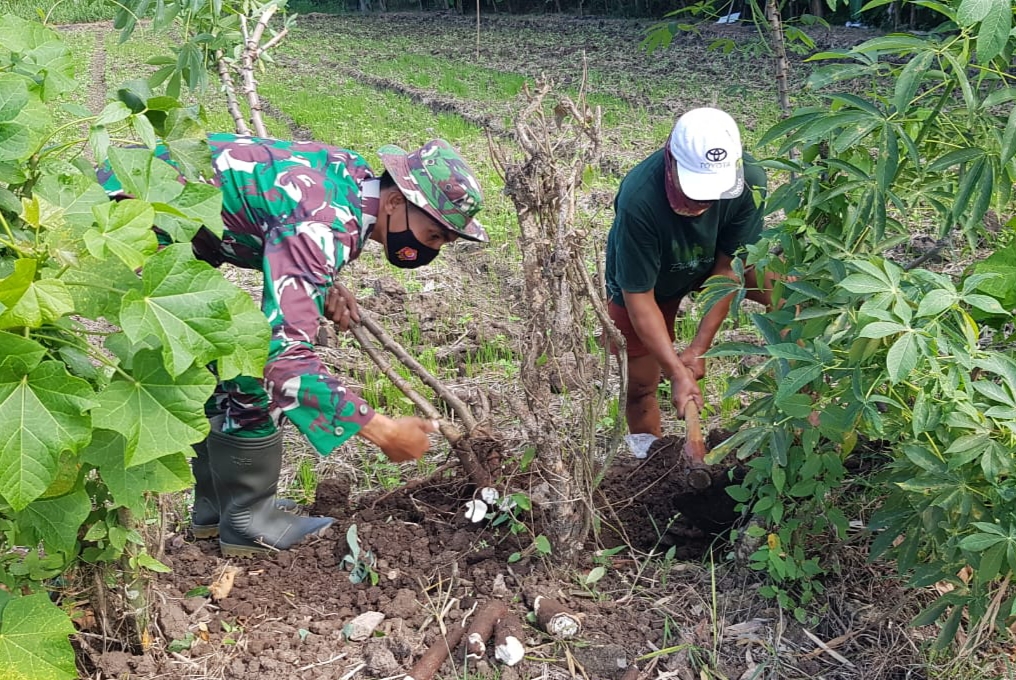 Pati – Pagi sebelum berangkat menuju lokasi pekerjaan pembangunan jalan sasaran fisik, Serda Sukarji anggota Satgas TMMD Reguler ke-111 Kodim 0718/Pati yang sedang melaksanakan tugas di Desa Tamansari, Kecamatan Jaken, Kabupaten Pati, masih menyempatkan diri untuk membantu warga yang panen singkong di kebunnya, Senin (12/7/2021).