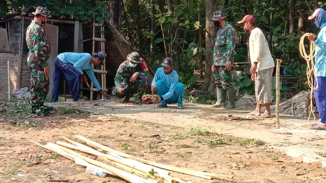 Anggota Satgas dan warga masyarakat ikut bergotong royong membantu pelaksanaan RTLH, dibagi tugas agar apa yang dikerjakan cepat selesai, Sertu Sujadi (48) salah satu anggota Satgas TMMD membantu pengukuraan sebelum digali, “Harus teliti ya pak, waktu pengukuran dan pasang patok,” ucapnya.