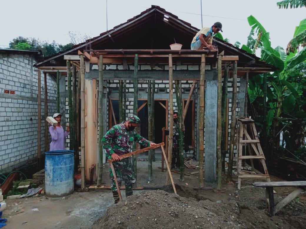 Hal itu terlihat saat anggota Satgas TMMD Reguler Ke-111 Kodim 0718/Pati, Serda Afandi turut membantu pemasangan kayu tiang untuk penyangga cor untuk teras rumah Mbah Ngarji, warga Dusun Kalimati RT. 03/02 Desa Tamansari, Kecamatan Jaken, Kabupaten pati.