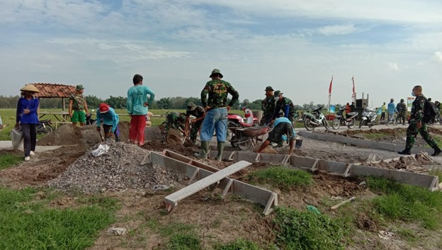 PATI – Anggota Satgas TMMD bersama warga mengunakan pasir batu dan tanah urukan yang digunakan sebagai penyempurna betonisasi jalan yang merupakan salah satu sasaran pokok TMMD Reguler Ke 111 Kodim 0718/Pati di Desa Tamansari, Kecamatan Jaken, Kabupaten Pati, Jawa Tengah.