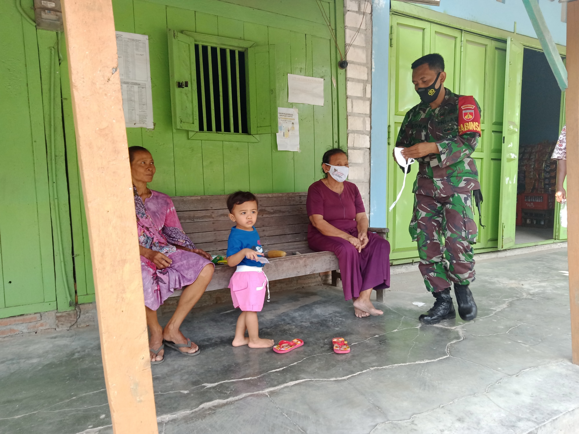 Sebagai bentuk partisipasi dan dukungan terhadap Posko Covid-19 di Desa Tamansari, Satgas TMMD ikut andil dalam pembagian masker kepada warga dan memberikan himbauan untuk tetap mematuhi protokol kesehatan dalam melakukan aktivitas sehari-hari, Minggu (06/6/2021)