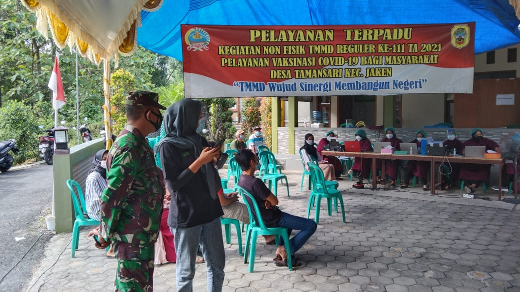 Pati – Selain melaksanakan pembangunan fisik dalam program TMMD ke 111, Kodim 0718/ Pati juga melaksanakan pembangunan non fisik. Salah satunya kegiatan vaksinasi kepada masyarakat. Seperti yang dilaksanakan pada hari ini, di Desa Tamansari,Kecamatan Jaken, Kabupaten Pati. Dimana, dalam pelaksanaan vaksinasi yang di pusatkan di kantor Balaidesa Tamansari tersebut warga sangat antusias mengikuti vaksinasi.