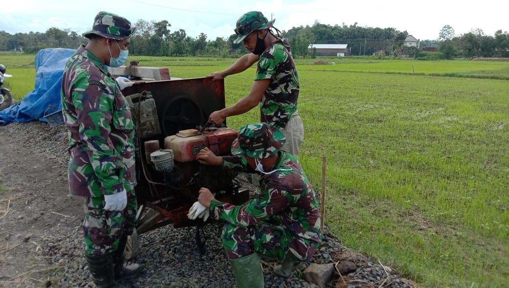 Pati – Anggota Satgas TMMD Pelda Dwi Sulistyo mendapati kendala kerusakan pada mesin molen pengaduk adonan cor beton di Program TNI Manunggal Membangun Desa (TMMD) Reguler Ke-111 Kodim 0718/Pati, Desa Tamansari, Kecamatan Jaken, Kabupaten Pati. Selasa (29/6/2021)