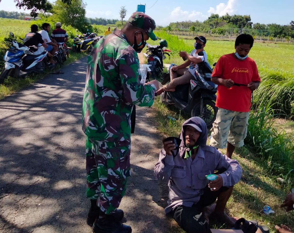 Pelda Sumarno anggota satgas TMMD Reguler 111 Kodim 0718/Pati, disela-sela istirahat melaksanakan kegiatan Non Fisik dengan cara Komunikasi Sosial (Komsos), memberikan masker secara gratis dan memberikan himbauan kepada warga masyarakat desa Tamansari, untuk membantu Pemerintah menerapkan PPKM Mikro Darurat guna menekan lonjakan angka kasus penularan atau penyebaran virus Covid19 tersebut.