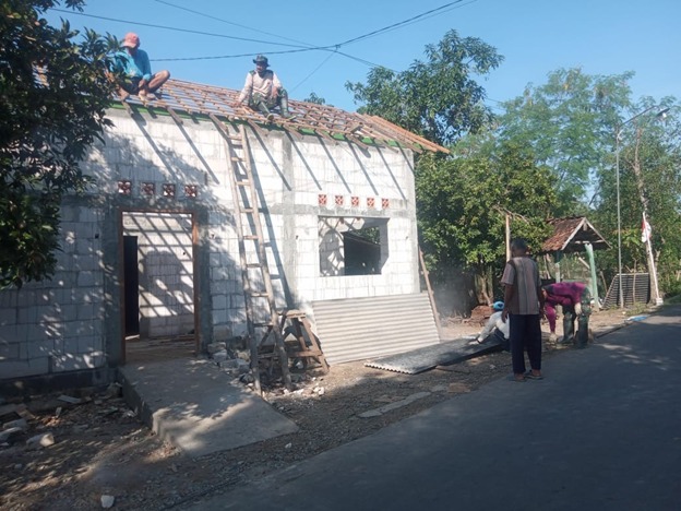 Salah satunya adalah rumah milik Sutarno, yang masih dalam proses pemasangan rangka atap rumah. Dan pengerjaan ini memerlukan ketelitian yang tinggi agar saat pemasangan atap bisa tepat.