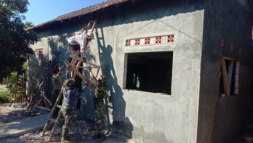 Pati – Program TNI Manunggal Membangun Desa (TMMD) Reguler Ke-111 Kodim 0718/Pati, dilokasi sasaran fisik bedah rumah milik Mudadi (69) warga Dusun Pandahan Rt.01 Rw.02 Desa Tamansari, Kecamatan Jaken, Kabupaten Pati. Kamis (8/7/2021)