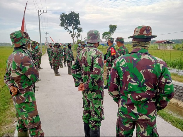 PATI – Apel pagi merupakan rutinitas bagi anggota Satgas TMMD ke-111 Kodim 0718/Pati beserta warga yang terjadwal, di desa Tamansari, Kecamatan Jaken, Kabupaten Pati, Jawa Tenga, Kamis (08/07/2021).