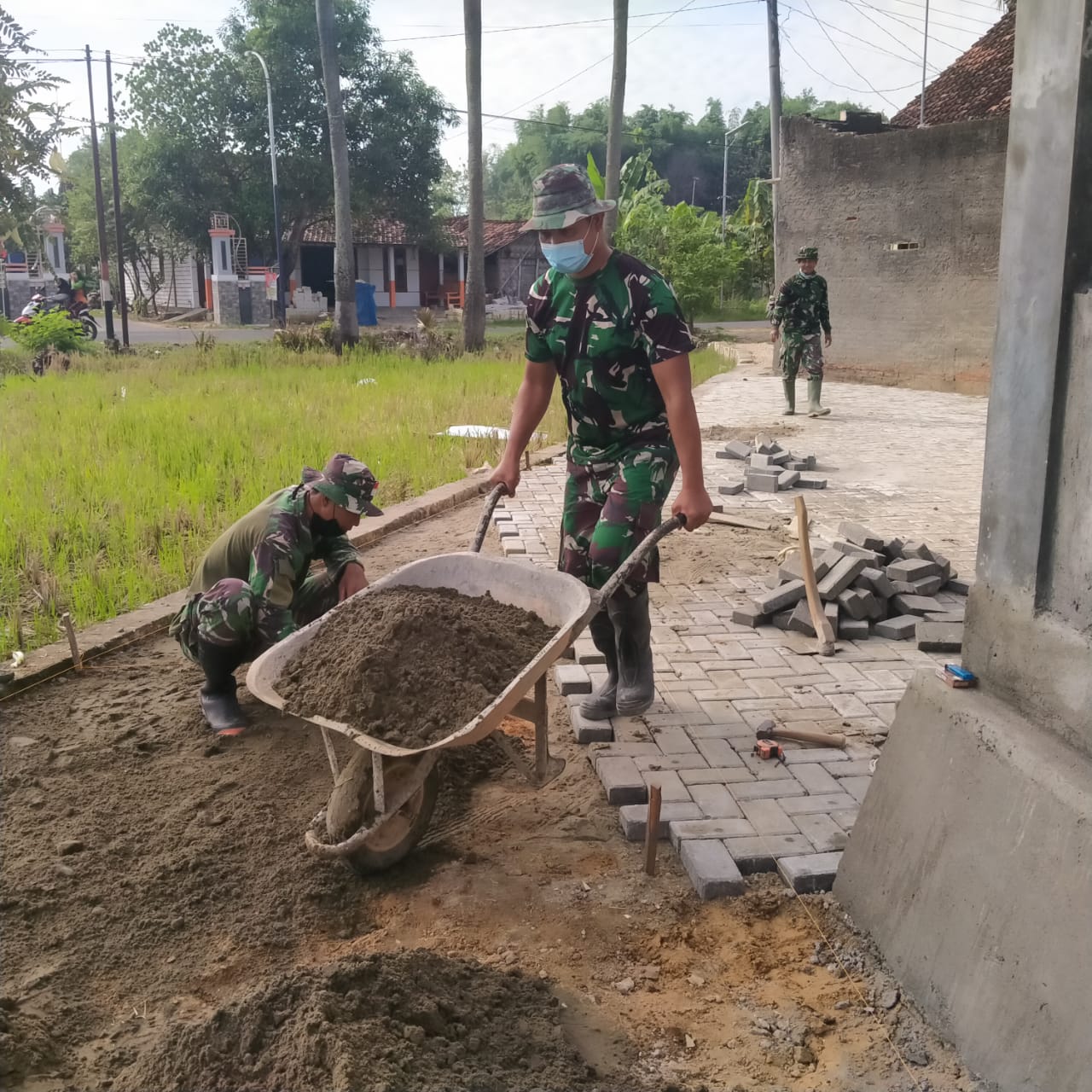 Terlihat anggota TNI satuan tugas TMMD sudah mulai melakukan aktivitasnya dalam pembangunan pelataran halaman masjid, semangat kerjanya kegiatan pagi ini.