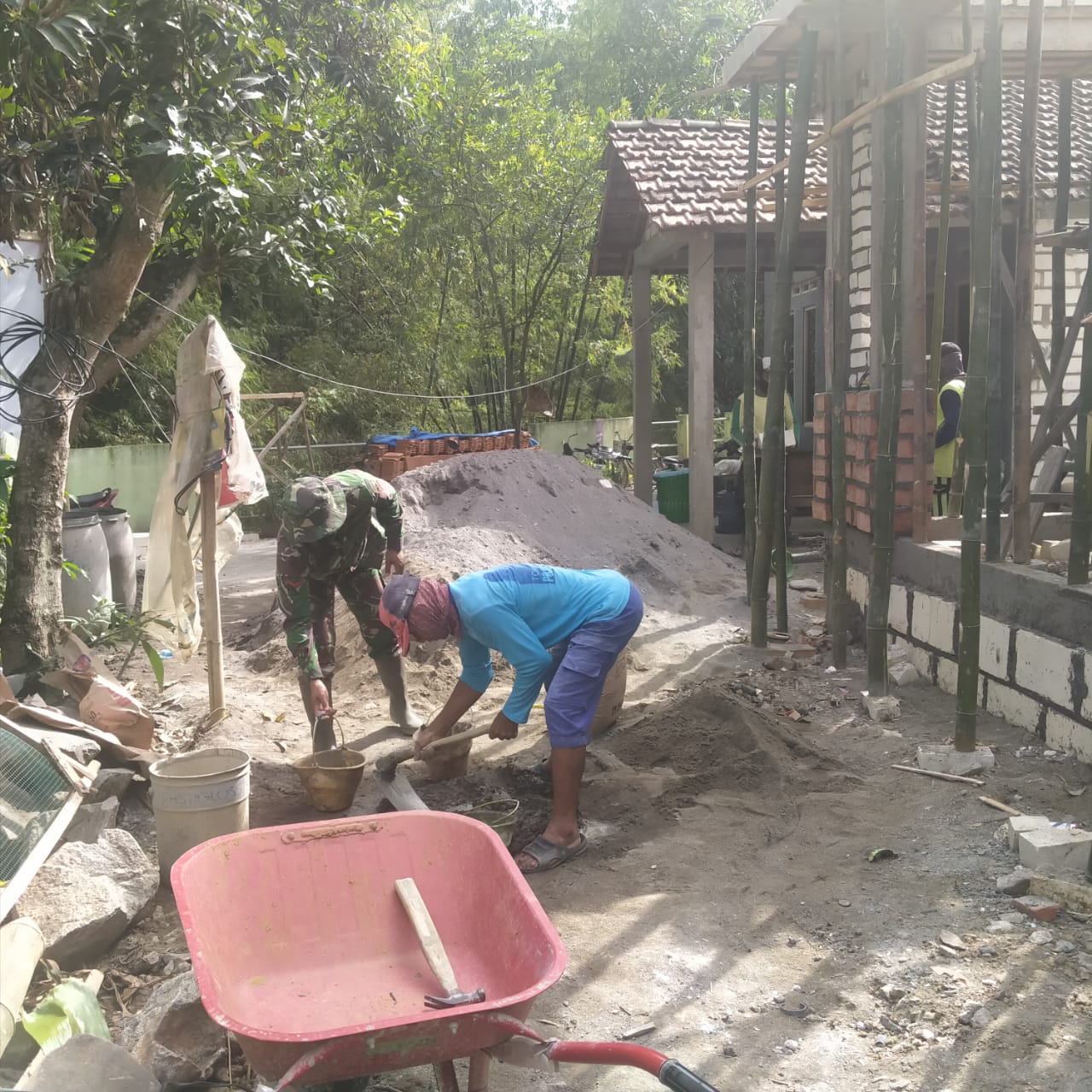 Anggota TNI dari Kodim 0718/pati ini seolah tidak ragu dengan apa yang dia kerjakan. Tanpa pikir panjang diambilnya ember yang berisi penuh adukan untuk dibawanya mendekat ke tukang.