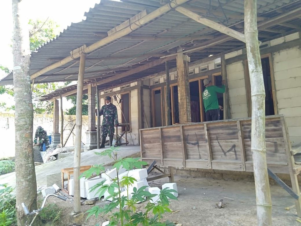 Kapten Budi K selaku Komandan mengatakan Pelaksanaan pengerjaan pembangunan RTLH Bapak Bekti Priyo menginjak hari ini diperkirakan sudah terpasang kusen pintu dan jendela kayu, Ungkapnya, (Pendim 0718).