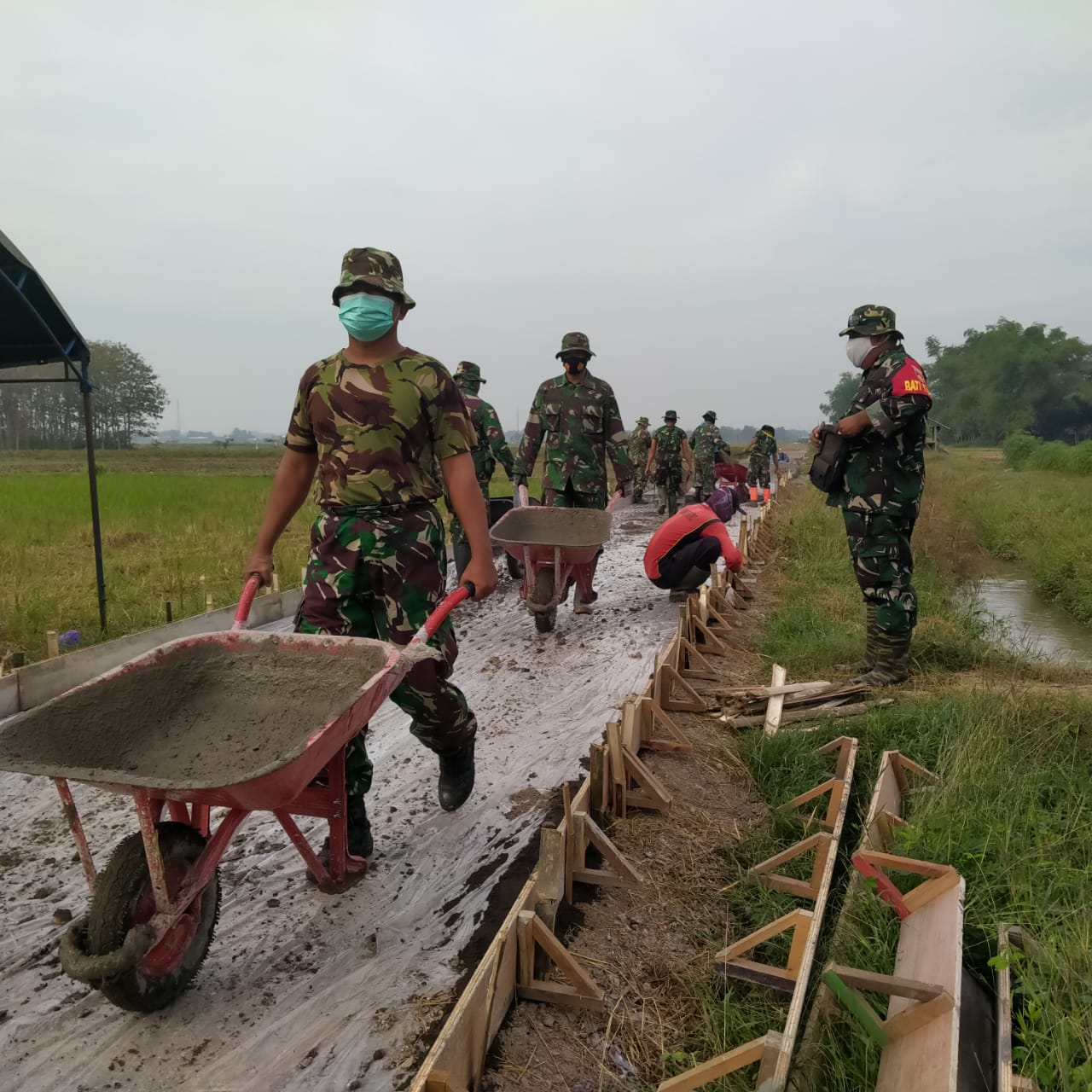 Terlihat dilokasi Pelda Agung sedang mengawasi jalannya pekerjaan pembangunan jalan desa di Desa Tamansari. Tanpa mengabaikan anjuran dari pemerintah tentang pandemi Covid 19 yang terjadi, demi keamanan dia selalu menggunakan protokol kesehatan saat bekerja.