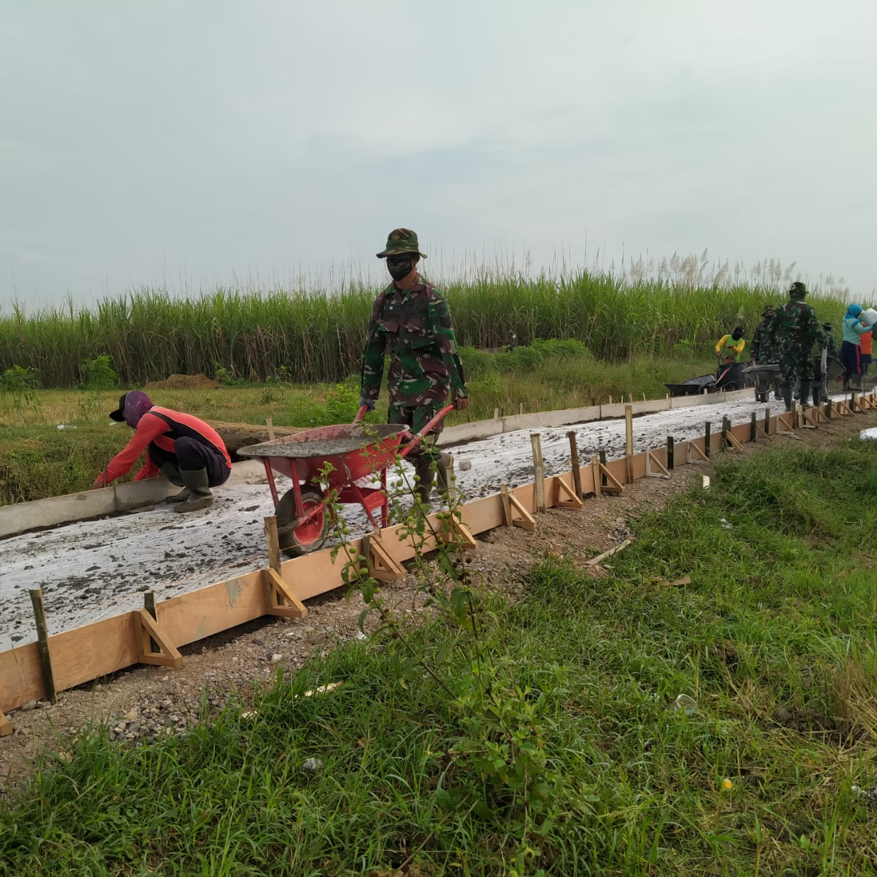 Seperti yang terlihat dilokasi Betonisasi jalan Desa Tamansari, terlihat warga yang ikut membantu pekerjaan jalan sedang membuat begisting untuk digunakan pengecoran terusan jalan selanjutnya. Meski banyak dari anggota TNI yang berlalu lalang dengan angkong berisi muatan adukan, namun dia tetap asyik dengan kegiatannya.
