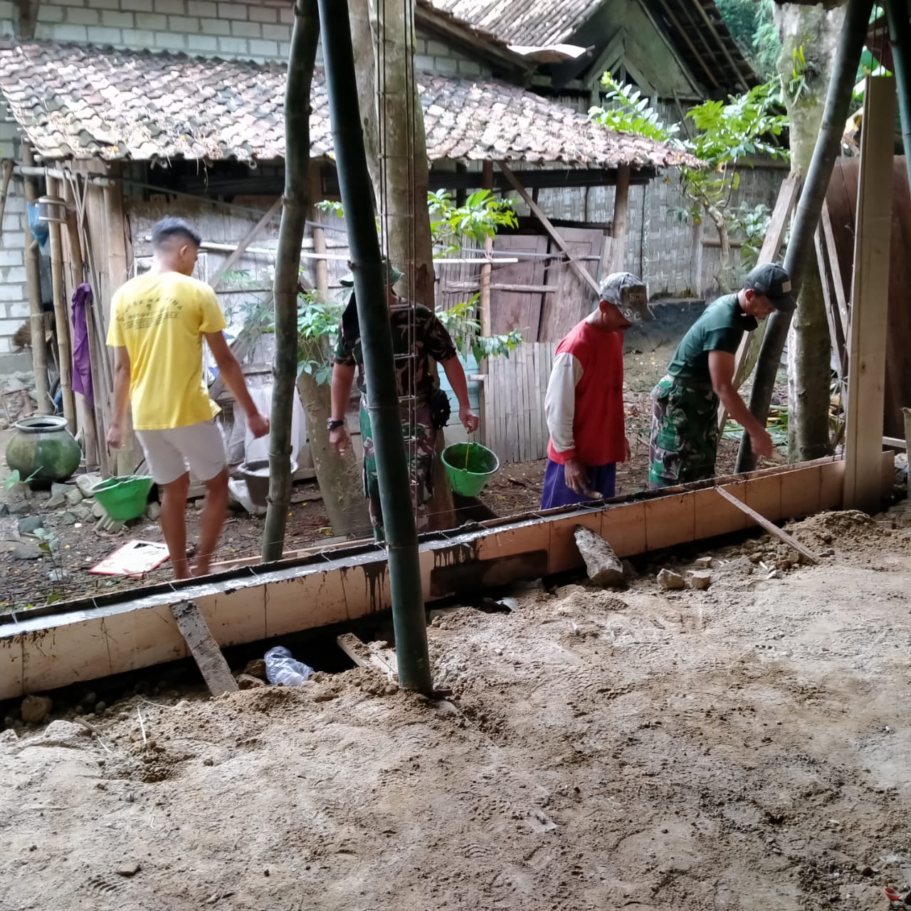 Agar mempercepat pembangunan, Sertu Aritonang(37) membantu meratakan adukan speci yang sudah dituang ke papan cetakan sloof. Sedikit demi sedikit diratakan adukan specinya sampai rata dengan garis atas papan begesting sloof yang dikerjakan.