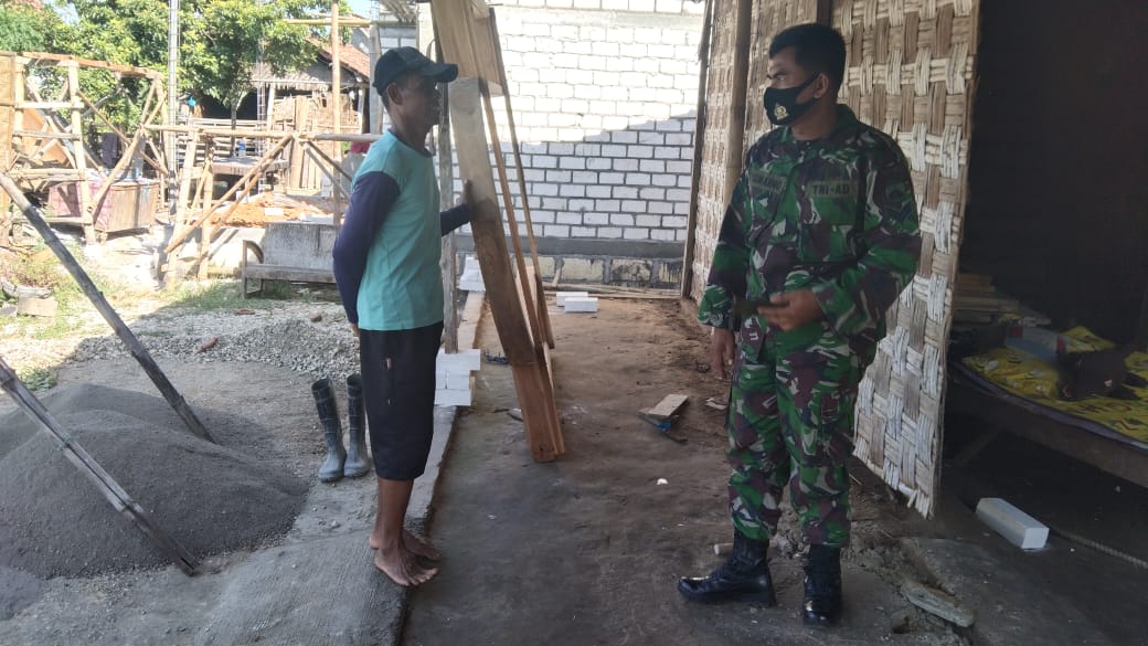 Pati – Satuan tugas (Satgas) Pra TNI Manunggal Membangun Desa (TMMD ) di Desa Tamansari, Kecamatan Jaken, Kabupaten Pati, Reguler 111 Kodim 0718/Pati, Sertu Sumarno sempatkan waktu untuk melihat lebih dekat masyarakat yang pembuat kusen kayu Program TMMD.