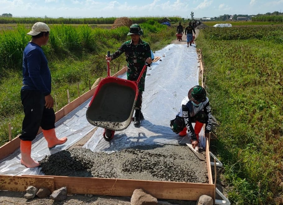 Pati – Satgas TMMD 111 Kodim Pati setelah meratakan permukaan jalan, siang ini tanpa lelah satgas TMMD bersama warga melanjutkan pekerjaan dengan pengecoran jalan betonisasi, mereka saling bergotong-royong membawa adukan semen dengan mendorong angkong secara bergantian, Rabu (16/06/2021).