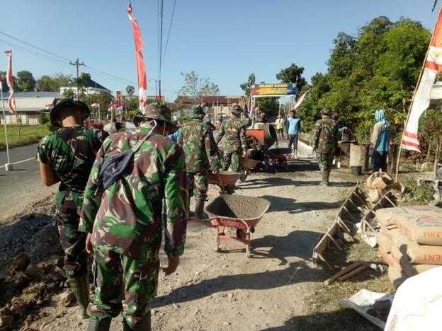 PATI — Program sasaran fisik Tentara Manunggal Membangun Desa(TMMD) Reguler ke-111 TA 2021 Kodim 0718/Pati di desa Tamansari, Kecamatan Jaken, Kabupaten Pati berupa pengecoran jalan sepanjang 1400 meter kini dalam proses Finishing.
