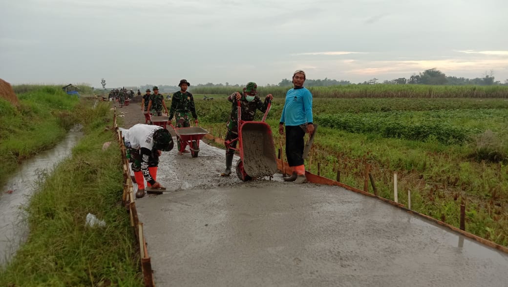 Pagi ini sejumlah warga dan satgas TNI Manunggal Membangun Desa (TMMD) terlihat sudah sibuk mengerjakan jalan penghubung Desa Tamansari dan Desa Sumber Arum. Kegiatan rabat beton ini sepanjang 1450 meter sangat membutuhkan tenaga yang sangat ekstra dalam menyelesaikanya. Jumat (18/6/2021)